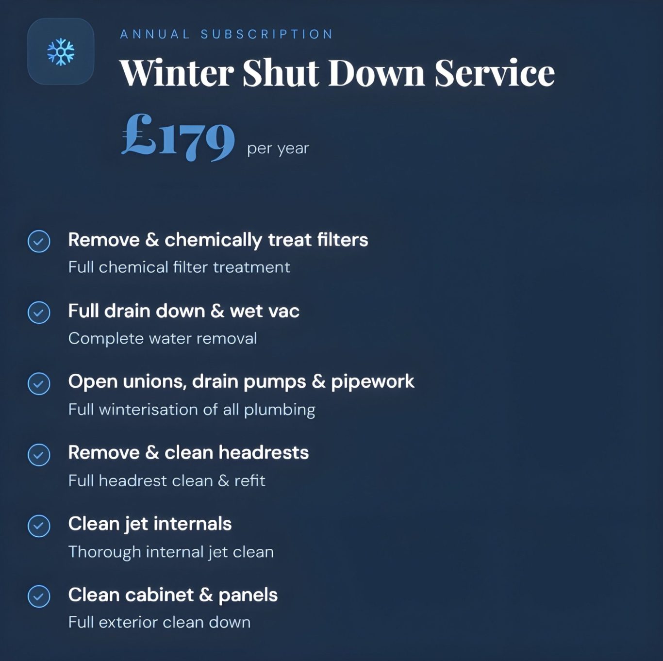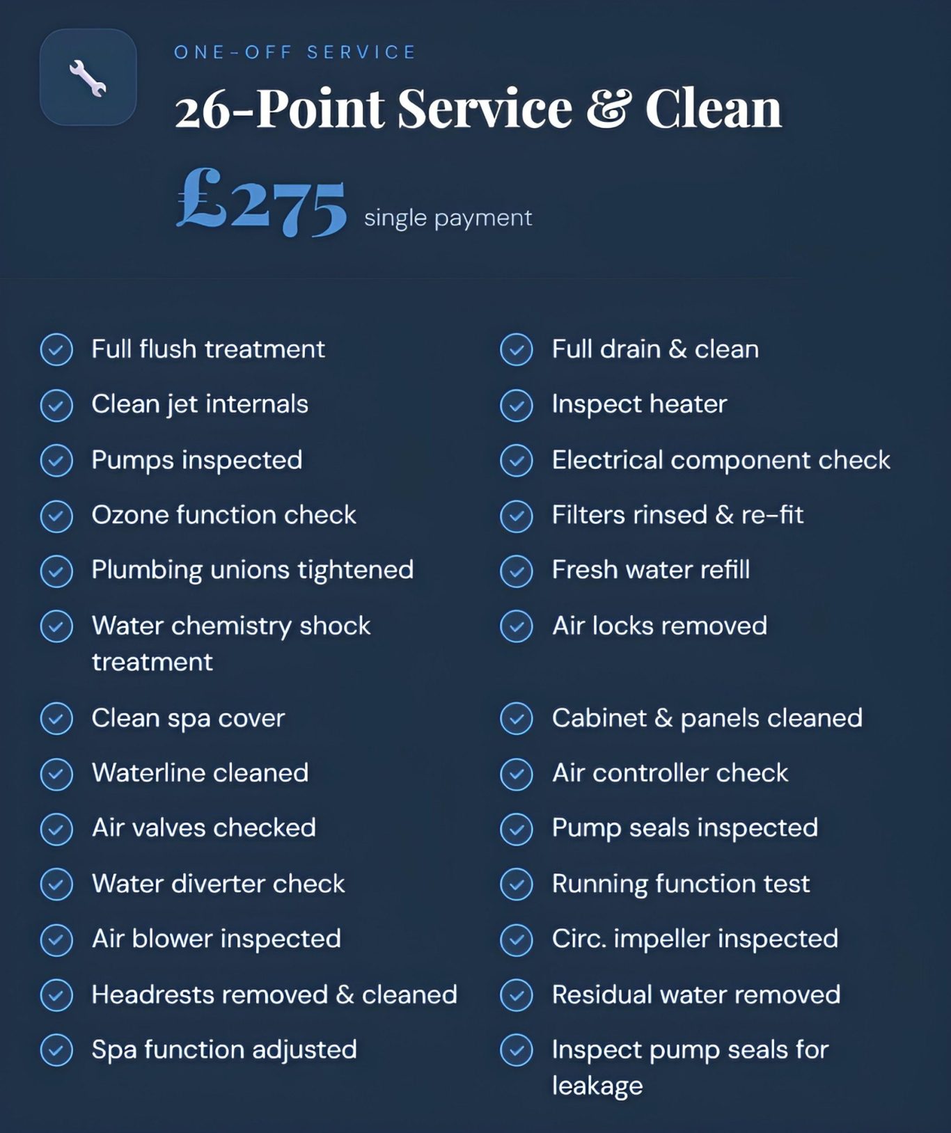 Give your spa the professional care it deserves. Our comprehensive 26-point service goes far beyond a simple water change. We perform a deep chemical flush of the internal pipework, a full structural and electrical inspection, and a meticulous detailing of every component from the jets to the headrests. It’s the definitive way to ensure your spa remains hygienic, efficient, and mechanically sound all year round.